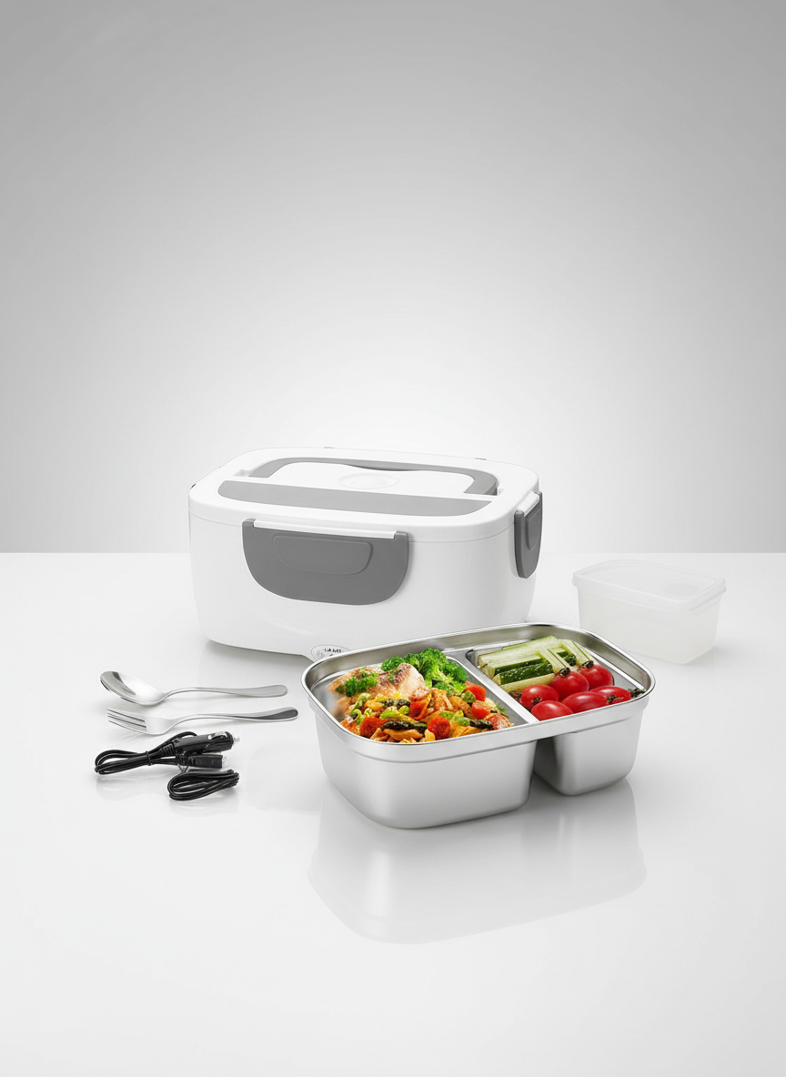 Place the filled container into the heating base and connect your chosen power cord. The lunch box will begin heating immediately. No buttons to press—just plug in and let it work.
